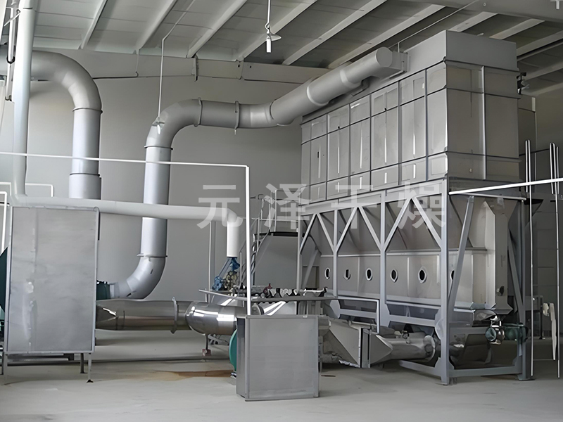 散粒狀固體物料由加料器加入流化床干燥器中,過濾后的潔凈空氣加熱后由鼓風(fēng)機(jī)送入流化床底部經(jīng)分布板與固體物料接觸,形成流態(tài)化達(dá)到氣固的熱質(zhì)交換。物料干燥后由排料口排出,廢氣由沸騰床頂部排出經(jīng)旋風(fēng)除塵器組和布袋除塵器回收固體粉料后排空。