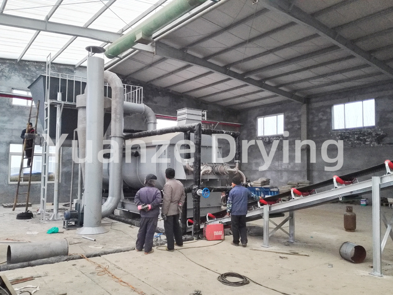 The sludge enters the guide plate inside the dryer through the chute of the feeding machine. As the cylinder rotates, the sludge is guided to the inclined lifting plate and lifted to the center position of the cylinder, gradually sprinkling to form a material curtain. High temperature airflow passes through it, causing the sludge to preheat and evaporate some moisture. When the sludge falls and moves onto the active grate wing, the material is mixed with the preheated grate wing, transferring heat to the material and causing some moisture to evaporate. At the same time, the material carried by the wing plate is lifted and sprinkled multiple times, and the material undergoes convection and contact heat exchange with the hot air flow. At the same time, the cleaning device buried in the material also slides down the inner side of the arc-shaped lifting plate to remove the material adhered to the inner wall of the lifting plate. After the cleaning device rotates along the vertical line of the cylinder, it is then dragged on the back of the circular arc lifting plate to remove the material adhered to the outer wall of the lifting plate. With the continuous rotation of the cylinder, some water evaporates and the sludge is further dried. At the same time, the cleaning device also plays a crushing role in the sludge ball, improving the drying speed. After the sludge is dried, it becomes a loose material with low moisture content and is discharged from the discharge port.